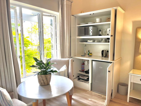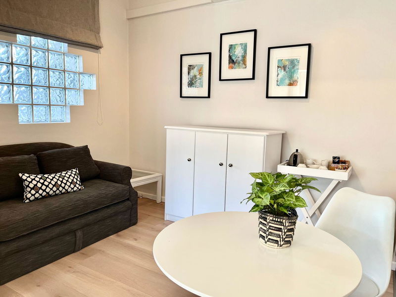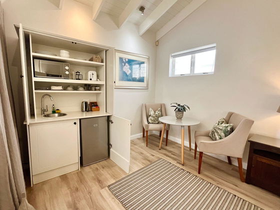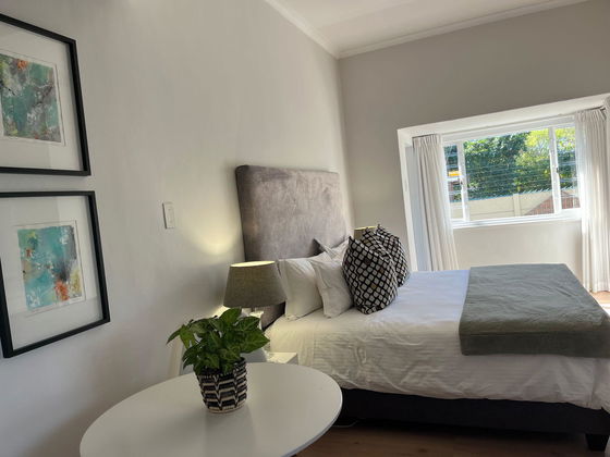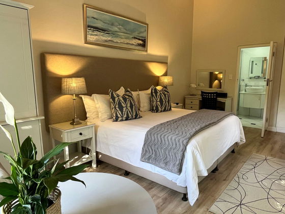 All spacious rooms are en-suite (shower only) and offers a separate entrance & secure parking. A stylish fitted kitchenette allows for an affordable self-catering option with a round bistro dining table and 2 comfortable chairs. 100% cotton percale linen, DSTV , Smart 4K 42 inch flat screen television, air conditioning, electric blankets for chilly winter evenings, hairdryer, free fibre Wi-Fi (stable mesh system), bar fridge, microwave, toaster, kettle, crockery and cutlery all add to a pleasant and comfortable stay.